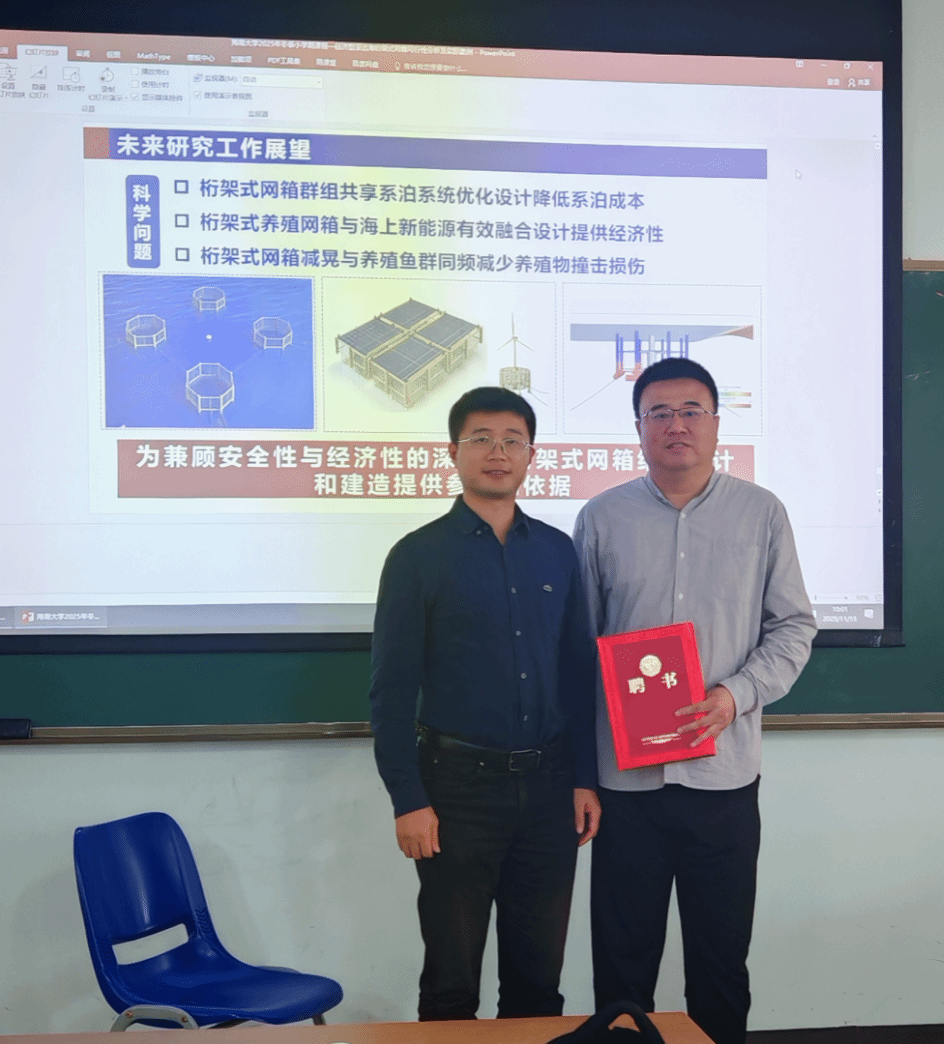 2025111516,大连理工大学赵云鹏教授应邀为海洋技术与装备学院开展为期两天的《深远海养殖关键装备水动力特性研究与技术创新》专题讲座讲座在威廉希尔中文官网海甸校区4号教学楼105教室举行开班仪式由学院副经理任年鑫教授(首日)与郑振钧副研究员(次日)共同主持。任年鑫副经理代表学院对赵云鹏教授表示热烈欢迎,并现场颁发了专家聘书。本次活动吸引了校内师生及海南本地企业代表的积极参与。
